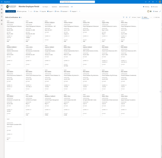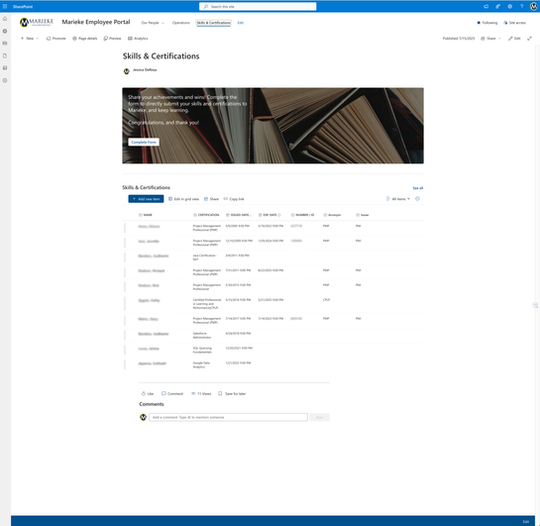 Skills Matrix: Built as a filterable Microsoft List, the Skills & Certifications Matrix allows staff to submit their credentials through a structured Microsoft Form. Submissions include issuing body, acronym, expiration dates, and file uploads—organized for both compliance and analytics.